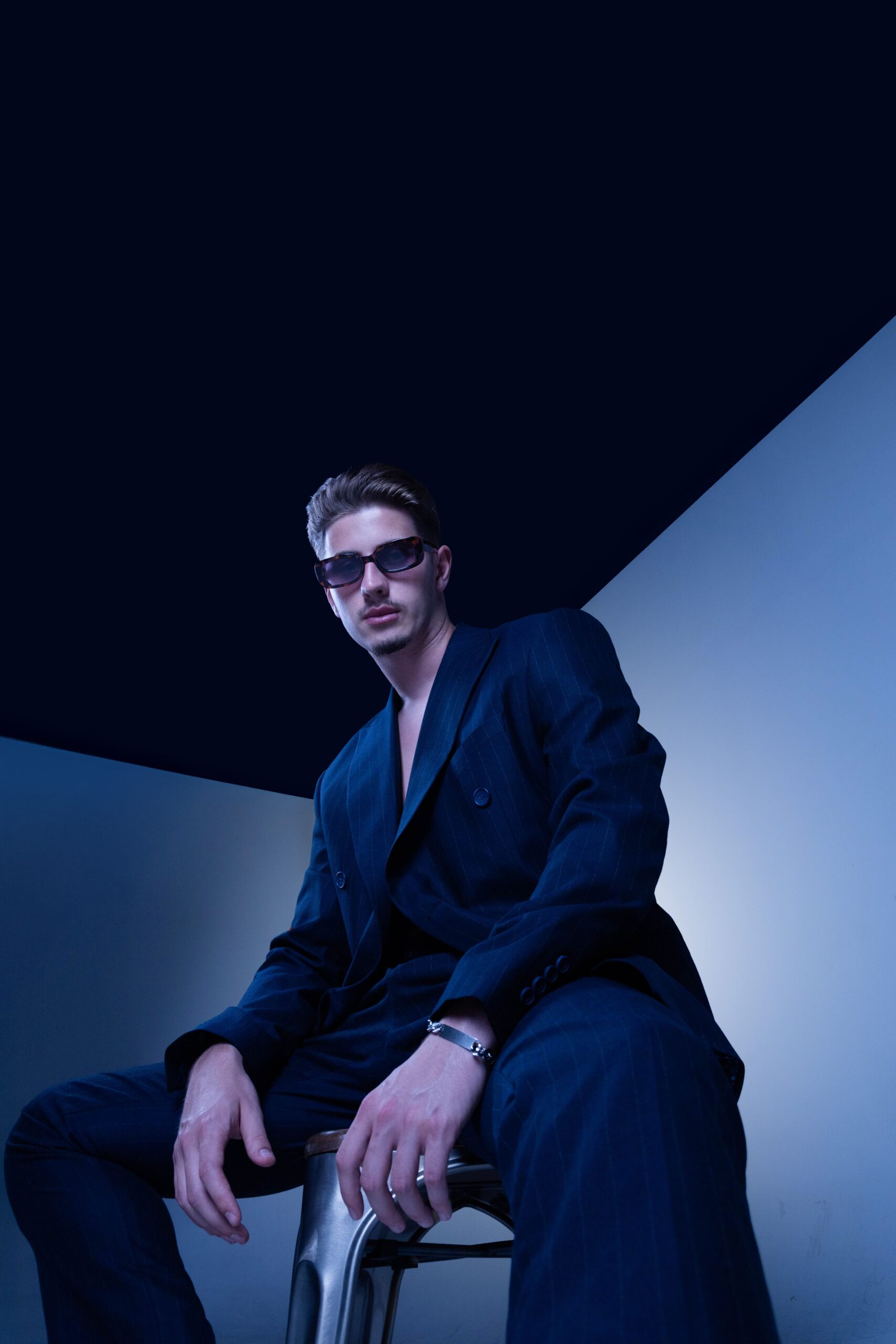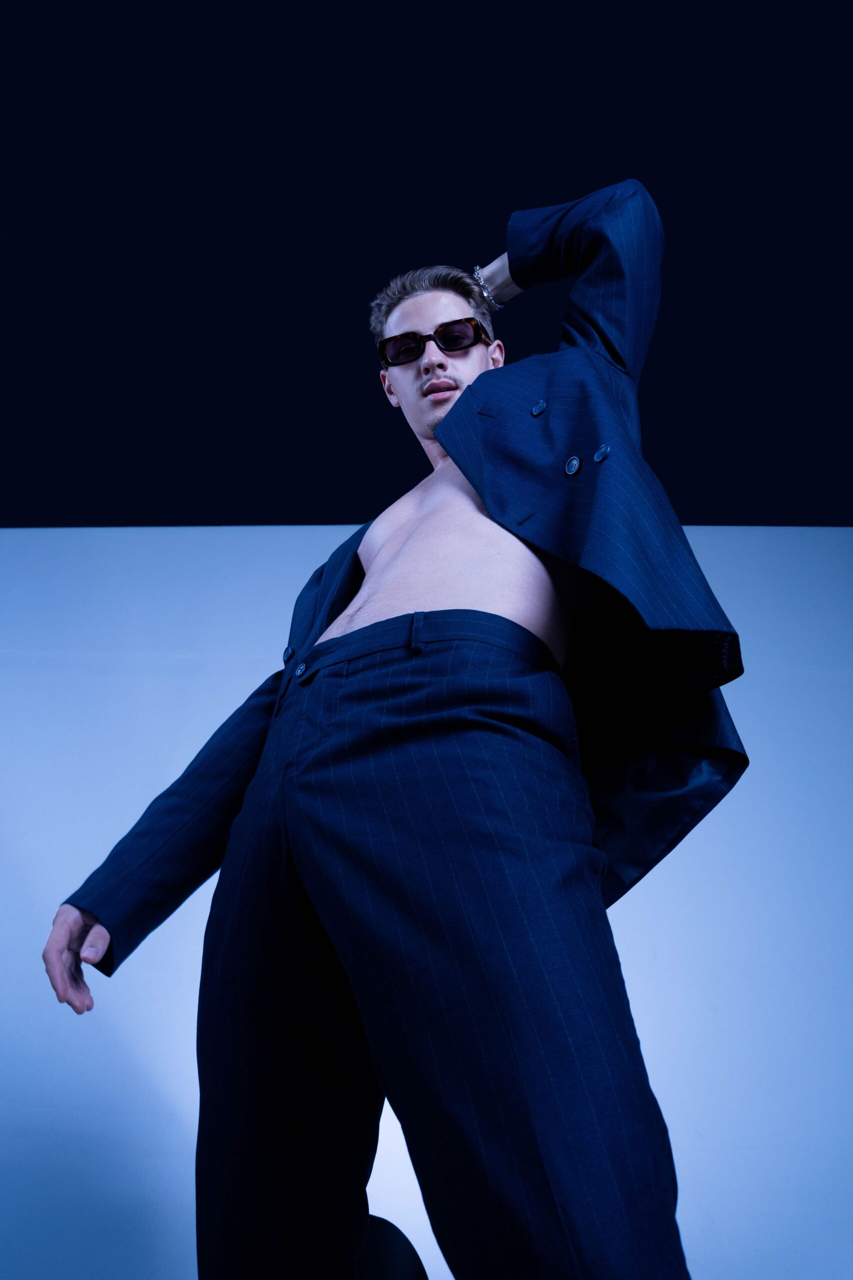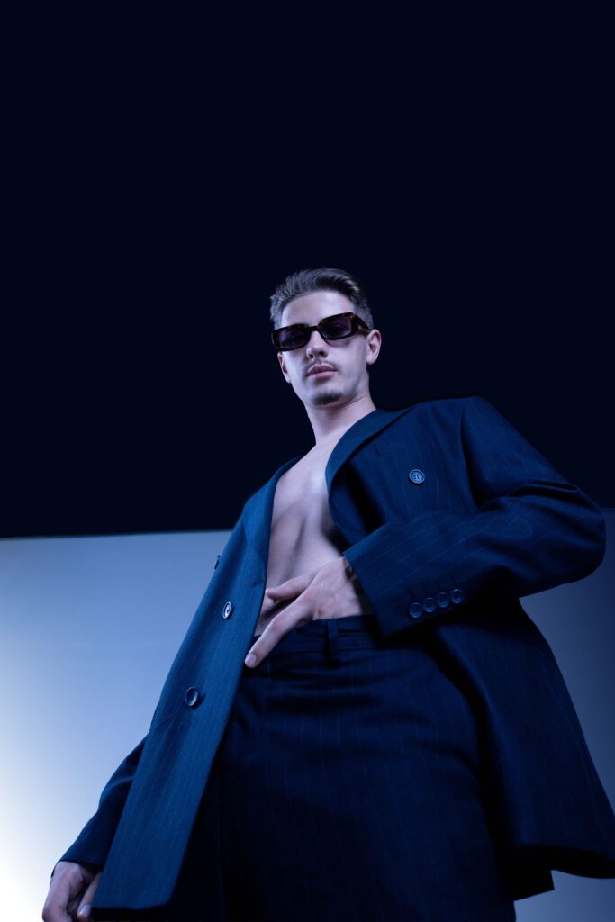 Lighting was kept soft but directional, creating stark shadows and emphasizing structure. Styling was kept clean, with every fold and layer of the suit playing into the larger visual rhythm. Poses were deliberately restrained, capturing stillness and tension in equal measure.