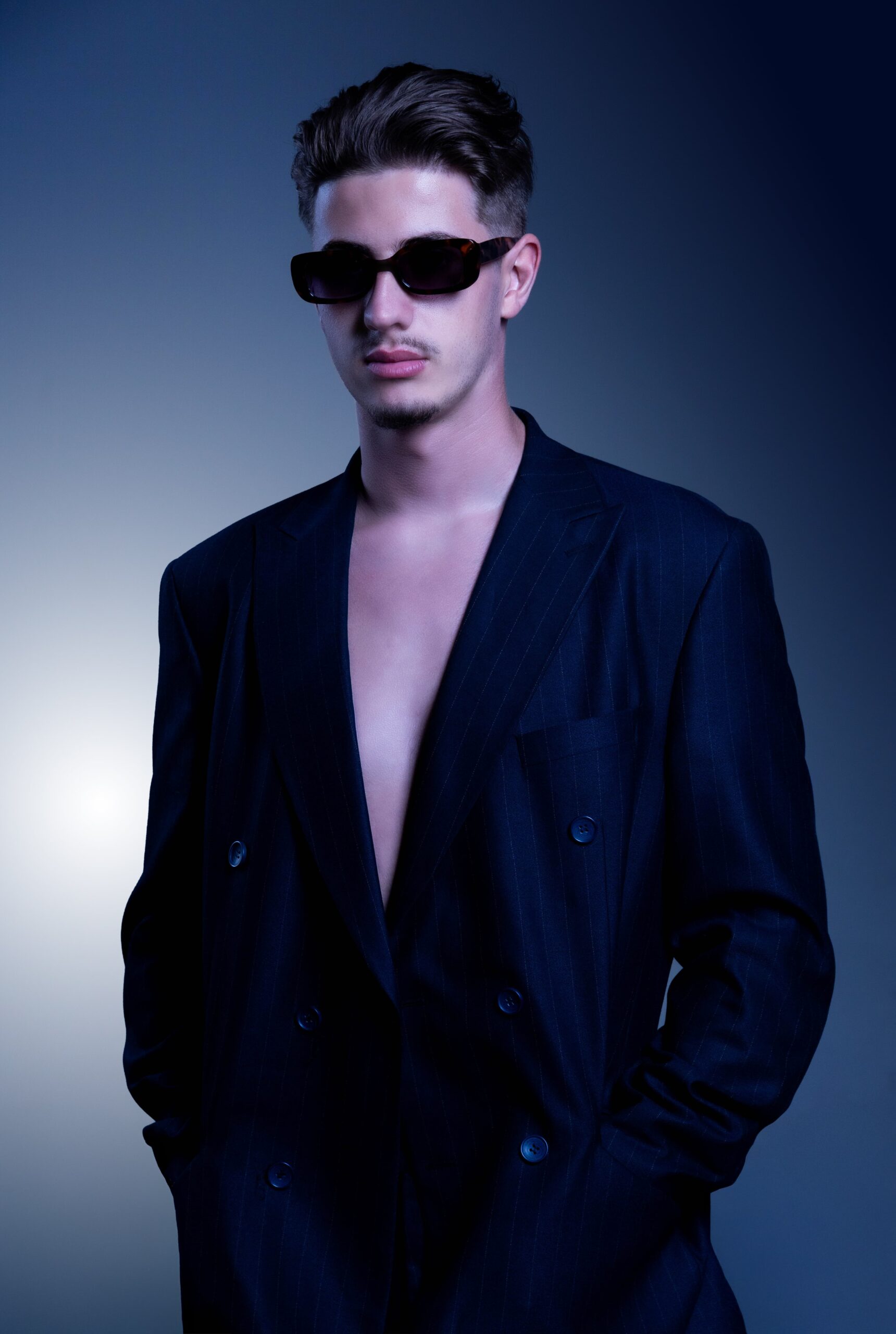 At the core of the concept was contrast: strength versus fragility, presence versus detachment. The oversized suit served as a central symbol—protective yet exposing. It exaggerates the figure, creating a tension between dominance and emptiness. The cold color palette—icy blues, greys, and desaturated tones—amplified the mood of emotional reserve, mirroring a distant internal world.